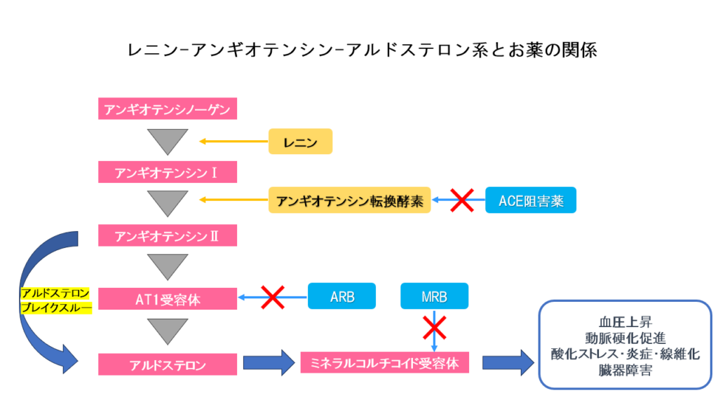 血圧を調節するレニン-アンギオテンシン-アルドステロン系に作用するACE/ARBを内服するとアルドステロンが低下し血圧が下がりますが、長期間の内服を行うと再びアルドステロン濃度が上昇するアルドステロンブレイクスルーという現象が起こります。アルドステロンブレイクスルーとは、簡単にいうと降圧薬が効かなくなり血圧が再上昇してしまう現象です。ACE阻害薬では40~50%程度、ARBでは20~30%程度でアルドステロンブレイクスルー現象が起こっていると報告されております。